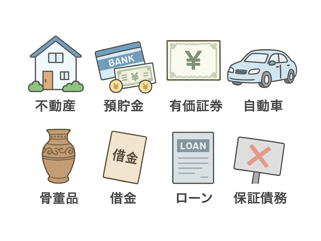 被相続人が生前に所有していた「プラスの財産(不動産、預貯金、有価証券、自動車、骨董品など)」と「マイナスの財産(借金、ローン、保証債務など)」です。マイナスの財産も相続される点に注意が必要です。財産の内容を正確に把握し、必要に応じて相続放棄などを検討することも大切です。